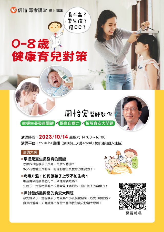 轉知 信誼基金會於10/14(六)舉辦「長不高?常生病?瘦巴 巴?~兒科醫師教你0-8歲健康育兒對策」線上講座
